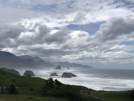 Kurz vor Cannon Beach liegt der Escola State Park, von hier hat man einen traumhaften Blick übers Meer, die Küste und den endlosen Strand von Cannon Beach mit seinem Haystack Rock. Den kleine Abstecher zu dem ersten großen Parkplatz im Escola State Park kann ich wirklich nur jedem ans Herzlegen, alleine für die Fahrt durch den ersten Abschnitt des State Parks und den Ausblick vom Parkplatz lohnt sich der Weg.